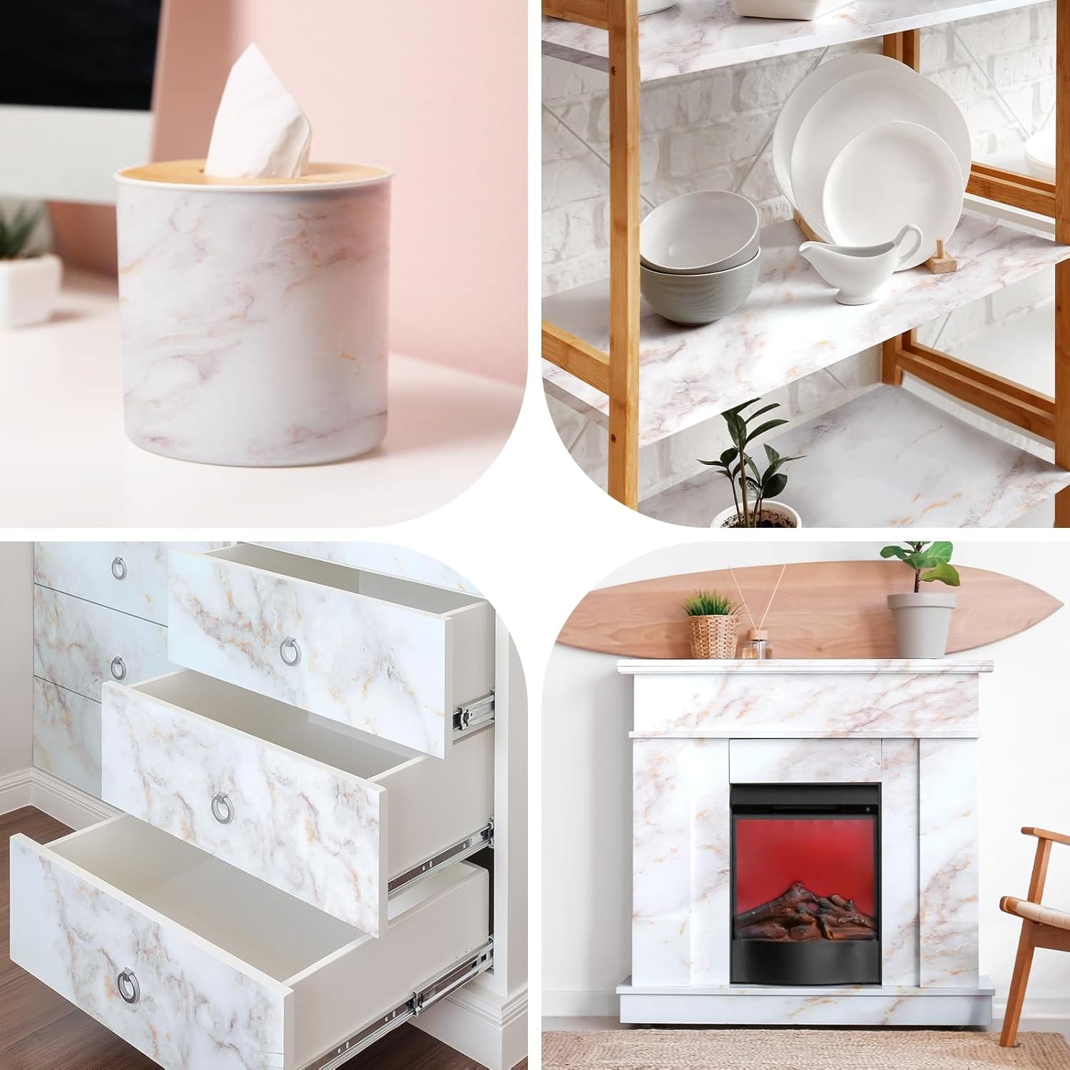 Έργα ανακαίνισης σπιτιού: Με την ευκολία εφαρμογής DIY, την ευελιξία για βελτίωση οποιασδήποτε επιφάνειας και την ανθεκτικότητα που διαρκεί, το μαρμάρινο χαρτί επαφής που ξεφλουδίζει και κολλάει γίνεται δημοφιλής επιλογή για έργα ανακαίνισης σπιτιού. Επιτρέπει στους ιδιοκτήτες σπιτιού να αλλάζουν γρήγορα την εμφάνιση των παλαιών επίπλων, πάγκων κ.λπ