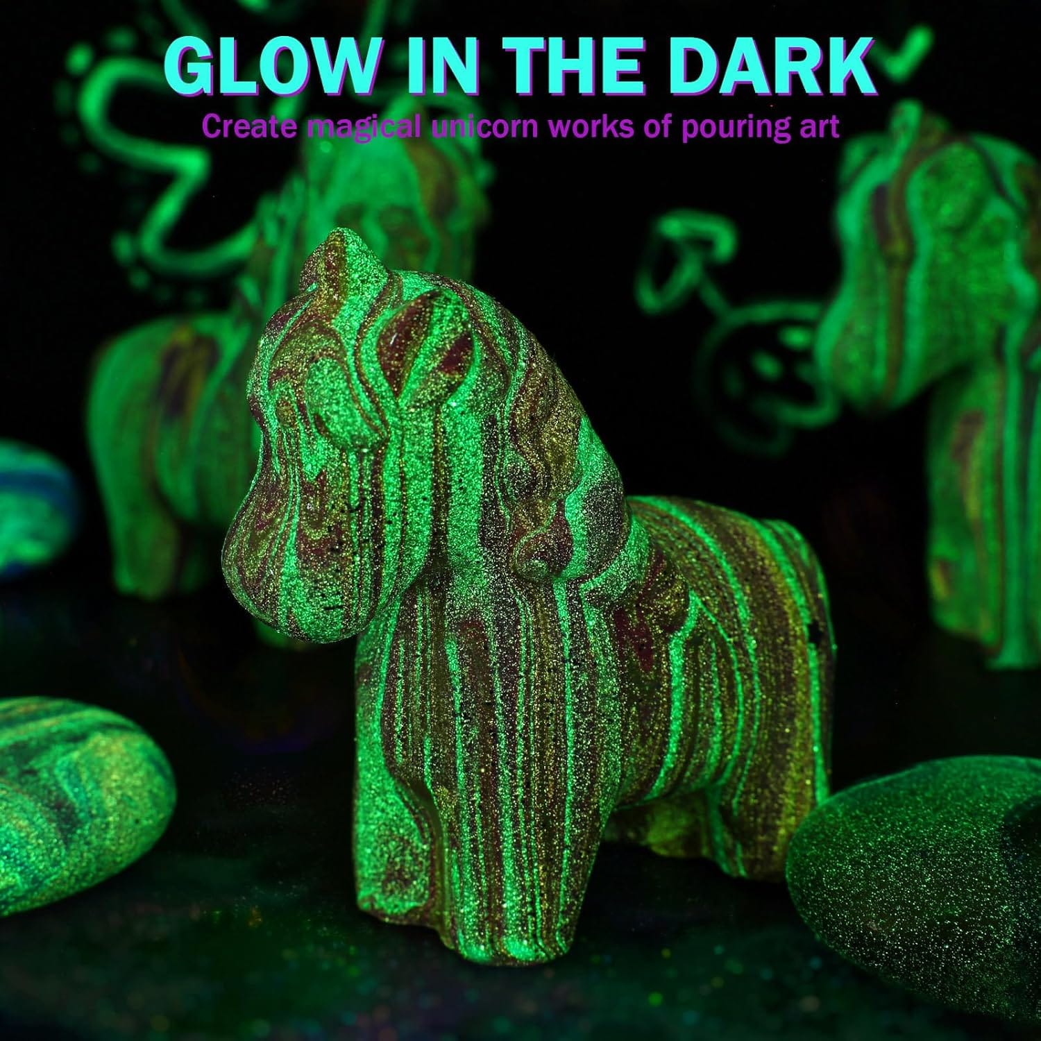 Το ξεχωριστό στοιχείο αυτού του κιτ είναι τα αφρώδη χρώματα που λάμπουν στο σκοτάδι. Όταν σβήσει το φως, τα χρώματα φωτίζουν και αποκαλύπτουν μαγικά, εντυπωσιακά σχέδια. Φαντάσου τη χαρά του παιδιού σου να βλέπει το δικό του μονόκερο να λάμπει στο σκοτάδι!
