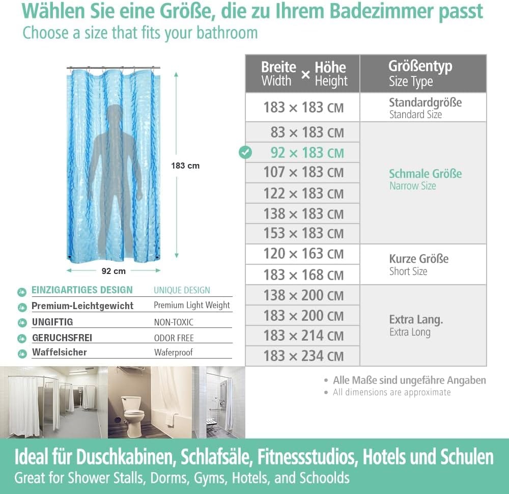 Λεπτό μέγεθος και ιδιαίτερος σχεδιασμός: Το τυπικό μέγεθος 92 cm x 183 cm ταιριάζει εύκολα σε οποιοδήποτε τυπικό μέγεθος μπάνιου και ντους. Ταιριάζει σε ίσιες και καμπύλες ράβδους ντους. Μπορεί να χρησιμοποιηθεί επιπλέον ή ως κάλυμμα για υφασμάτινη κουρτίνα μπάνιου. Δεν χρειάζεται πλέον να ανησυχείτε για το πώς θα το συνδυάσετε με την αγαπημένη σας υφασμάτινη κουρτίνα μπάνιου. Εάν έχετε την αγαπημένη σας υφασμάτινη κουρτίνα μπάνιου, τότε αυτό το κάλυμμα είναι η καλύτερη επιλογή για εσάς.