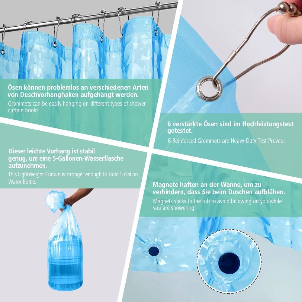 Λεπτό αλλά καλής ποιότητας: Κατασκευασμένο από υψηλής ποιότητας υλικό EVA με πάχος 0,8 mm. Αυτή η κουρτίνα μπάνιου είναι λεπτή (ελαφριά) αλλά ισχυρή και δεν έχει πλαστικές οσμές. Κάθε κουρτίνα έχει περάσει το τεστ βάρους μας στο Eazzier Bath Lab, το οποίο μπορεί να κρατήσει τουλάχιστον 5 γαλόνια (18,9 λίτρα) μπουκάλια νερού. Αυτή η υψηλής ποιότητας, ελαφριά κουρτίνα μπάνιου θα δημιουργήσει ένα καλύτερο μπάνιο για εσάς και την οικογένειά σας. Αποκτήστε ένα ζευγάρι κουρτίνες μπάνιου Eazzier για να το μάθετε!