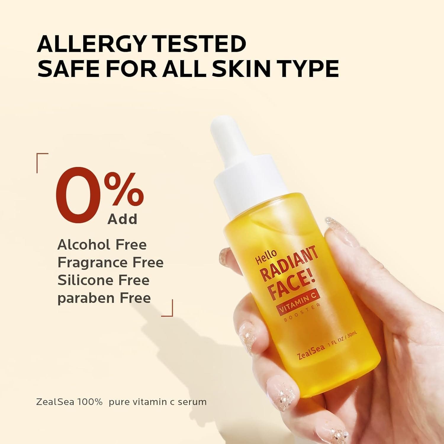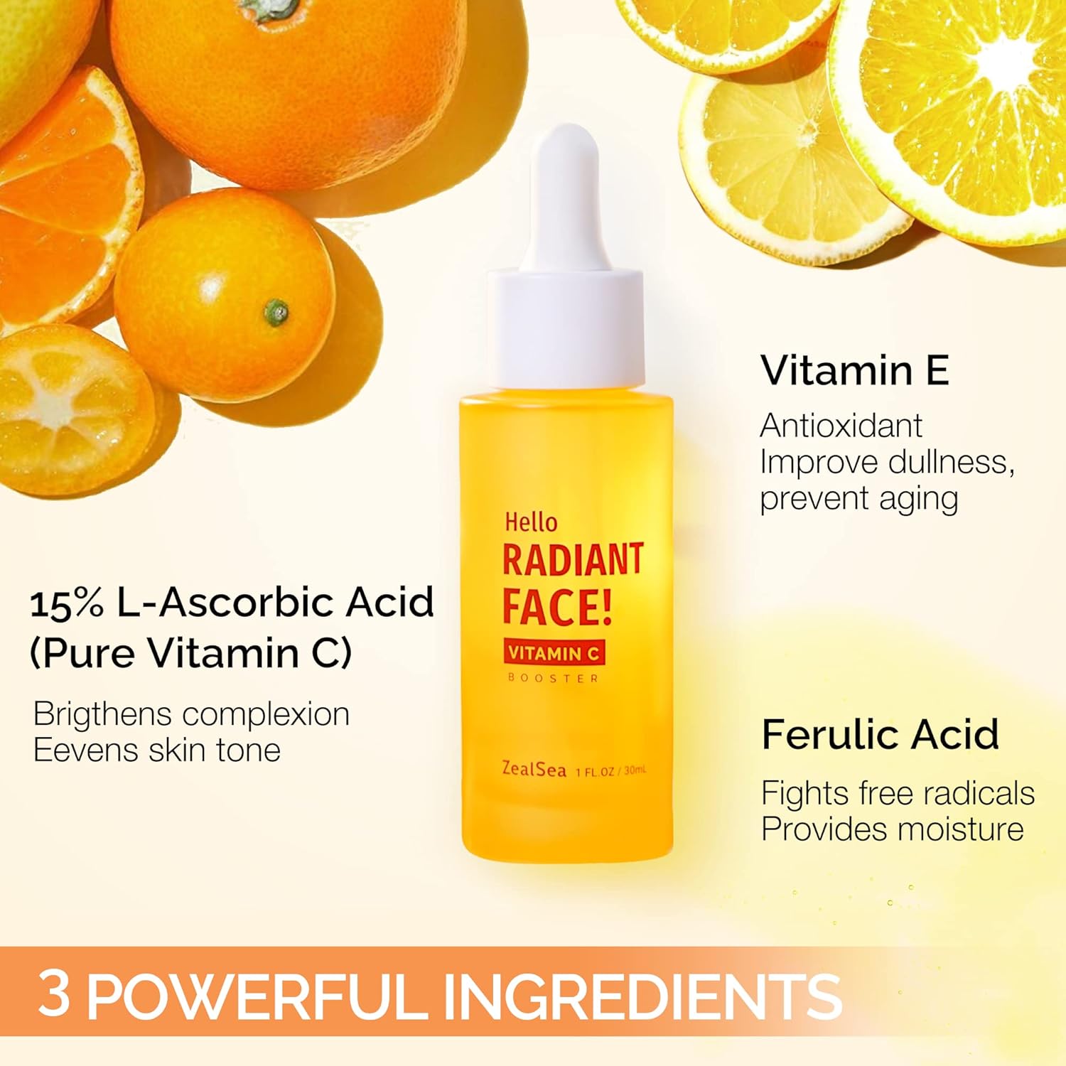 Φωτεινότητα και Διόρθωση Μάυρων κηλίδων: Ο ορός προσώπου βιταμίνης C ZealSea χρησιμοποιεί την πιο διάσημη φόρμουλα με καθαρό Λ-Ασκoρβικό Οξύ, Βιταμίνη E και Φερουλικό Οξύ. Αυτός ο ορός όχι μόνο βελτιώνει τη σταθερότητα της βιταμίνης C, αλλά φωτίζει το δέρμα, μειώνει τις σκούρες κηλίδες, παρέχει αντιοξειδωτική προστασία, μειώνει τις βλάβες από UV και ενισχύει την ελαστικότητα του δέρματος.