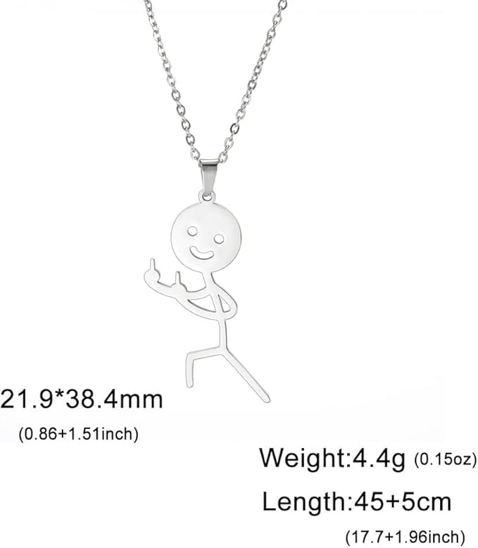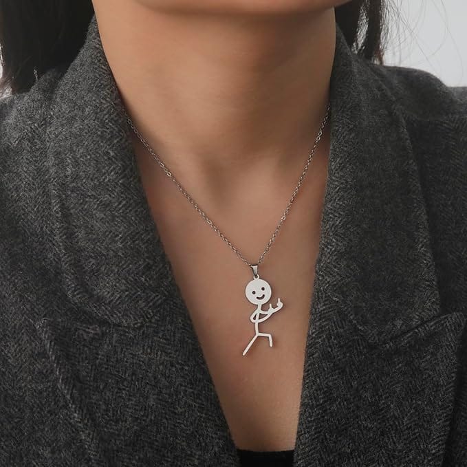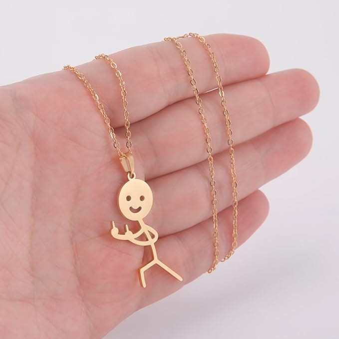 Αν θέλεις να στείλεις ένα ξεχωριστό μήνυμα με το στυλ σου, αυτό το χρυσό κολιέ με τον Stickman που δείχνει δύο μεσαία δάχτυλα είναι η ιδανική επιλογή. Ένα κομμάτι με μοναδικό χαρακτήρα που θα γίνει η αγαπημένη σου προσθήκη στη συλλογή κοσμημάτων — για να εκφράζεις την αληθινή σου διάθεση με στυλ και χιούμορ.