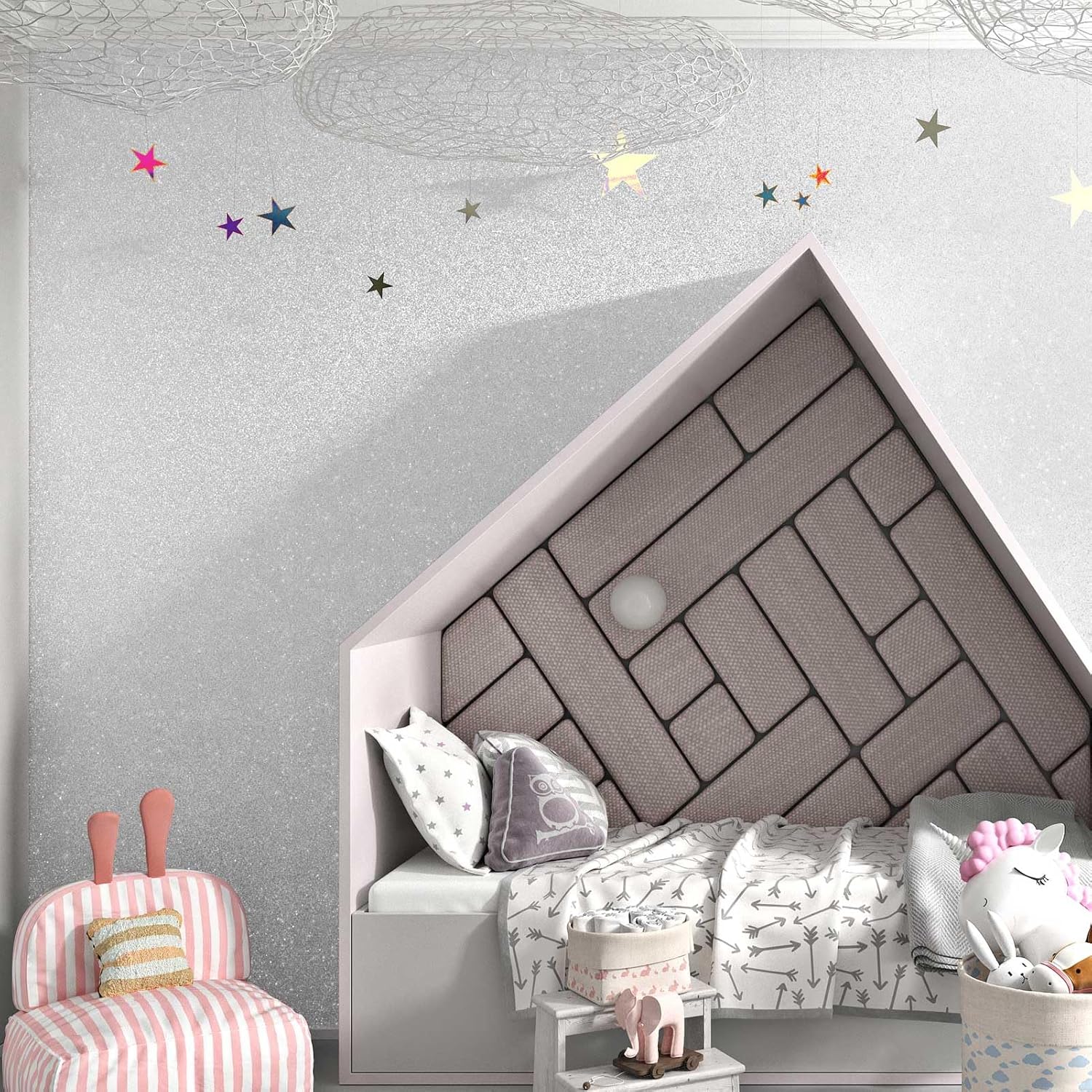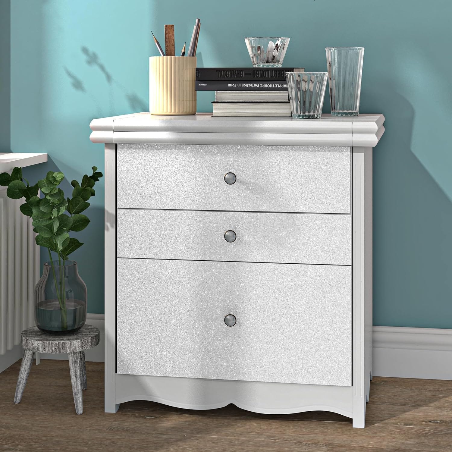 Ξεχωρίστε με την ασημί glitter ταπετσαρία μας Yullpaper, ιδανική για να προσθέσετε μια πινελιά κομψότητας στο σπίτι σας.