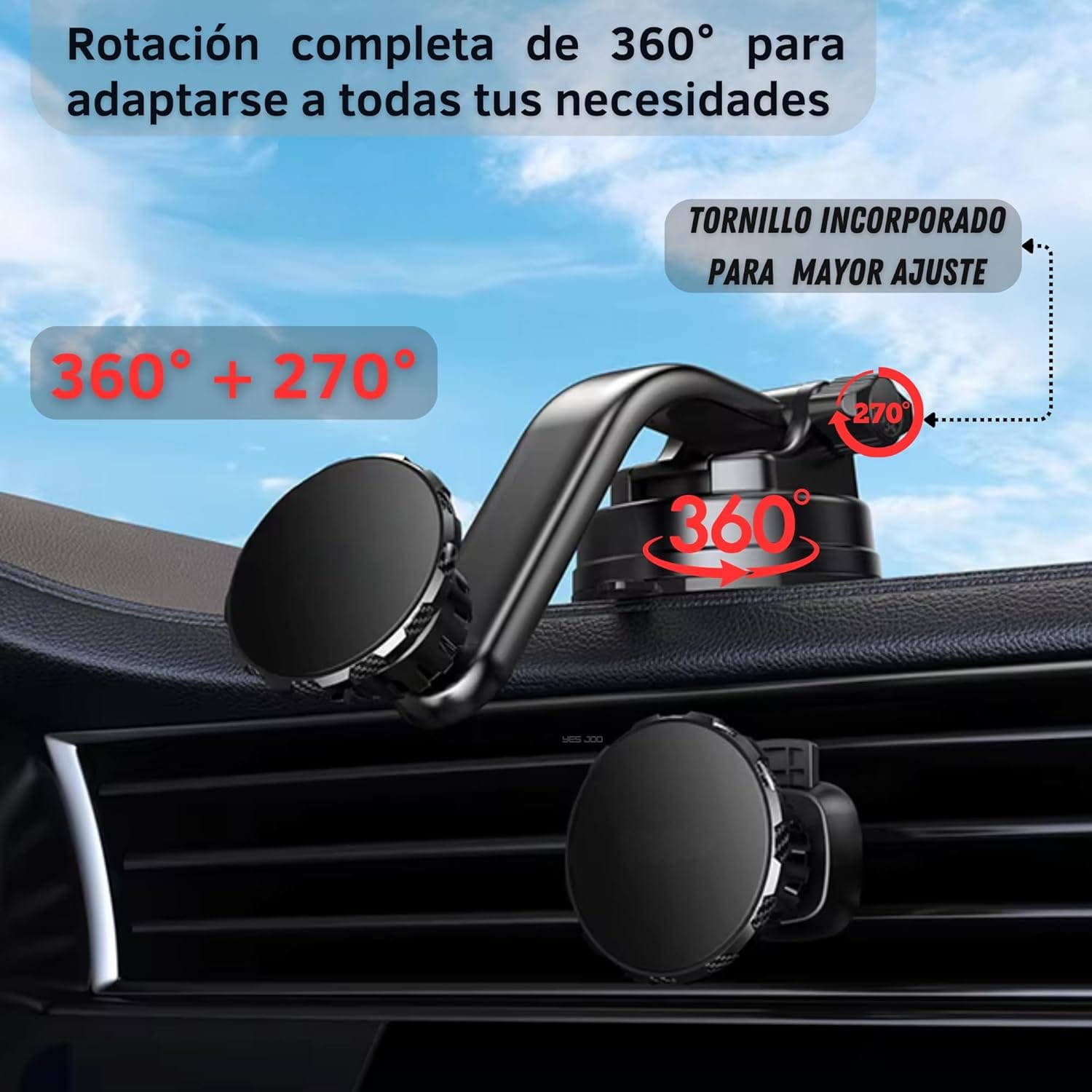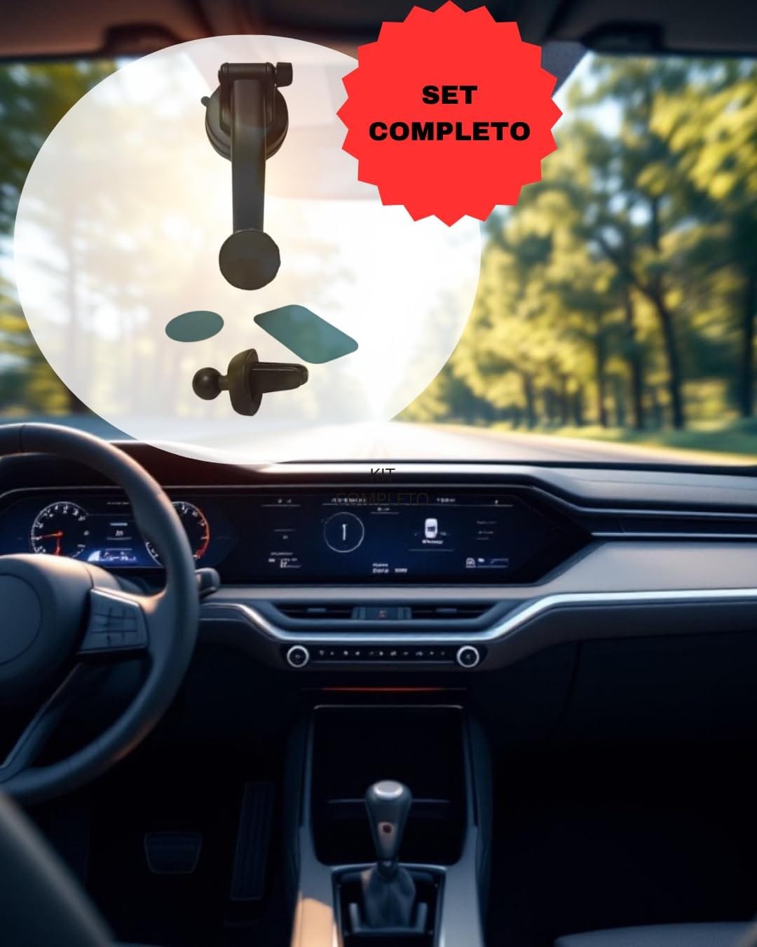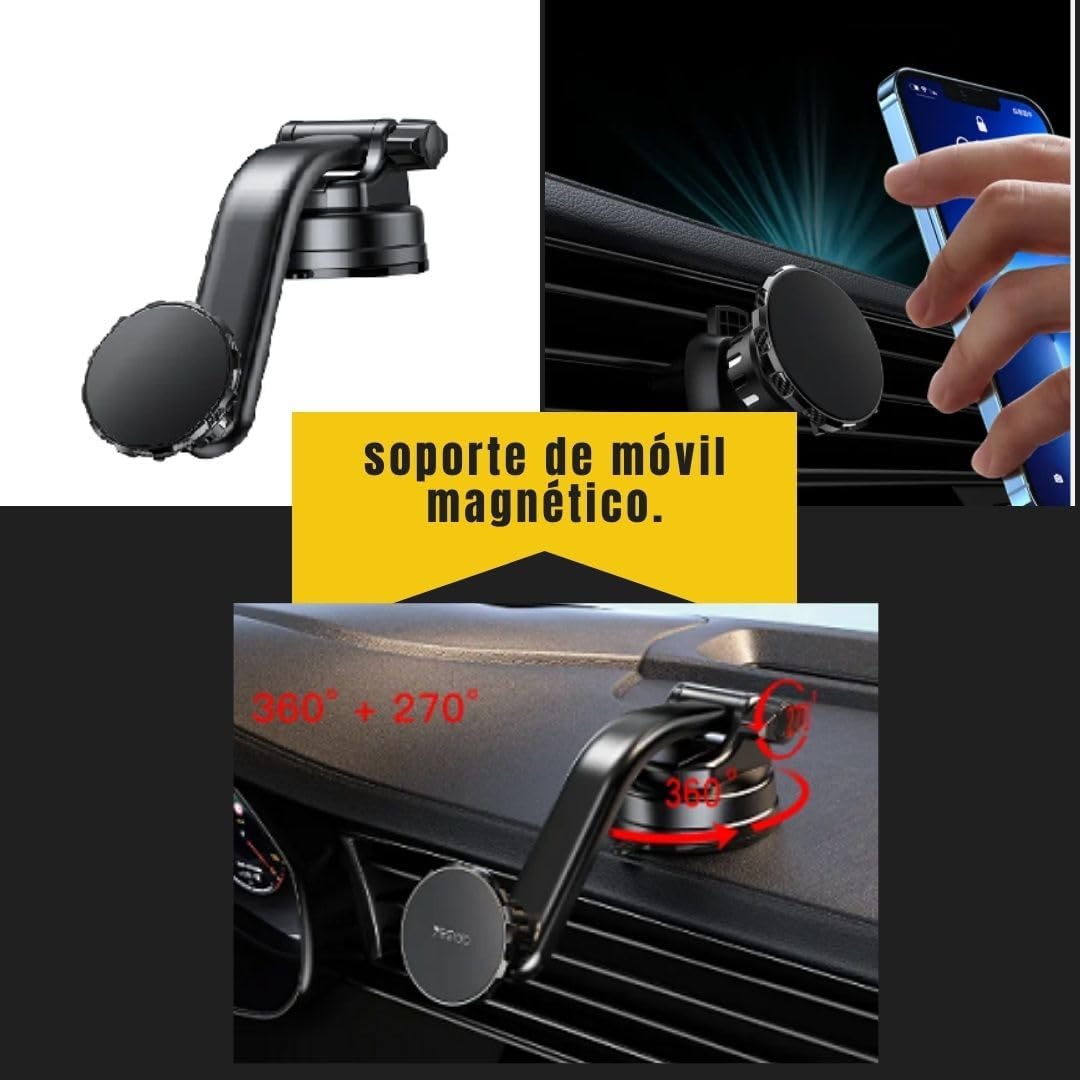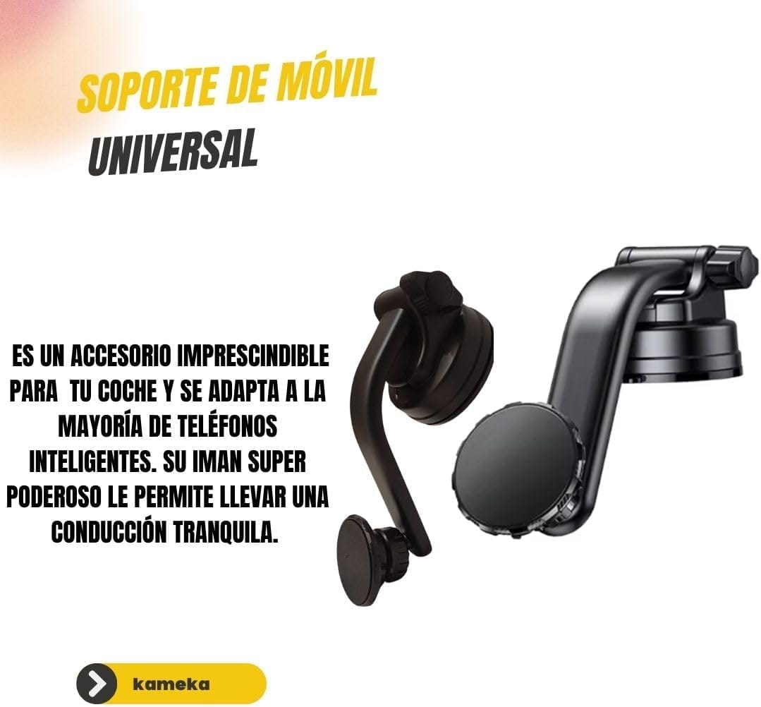 Περιλαμβάνει μαγνητική θήκη κινητού τηλεφώνου που σχηματίζεται από 4 μαγνήτες N50 υψηλού μαγνητισμού. Επιπλέον, διαθέτει δύο συστήματα στερέωσης. Ένα κλιπ για να το αγκυρώσετε στον αεραγωγό και έναν ρυθμιζόμενο βραχίονα τόσο σε μήκος όσο και σε περιστροφή, ώστε να μπορείτε να προσανατολίσετε το τηλέφωνό σας κατά 360°. Ο βραχίονας είναι εξοπλισμένος με μια υπεραπορροφητική βεντούζα που, εκτός από το παρμπρίζ, επιτρέπει την τοποθέτησή του στο ταμπλό. Το σετ διαθέτει επίσης δύο αυτοκόλλητα μεταλλικά φύλλα για να τα στερεώσετε σε δύο συσκευές και ένα υγρό μαντηλάκι για να καθαρίσετε την επιφάνεια.