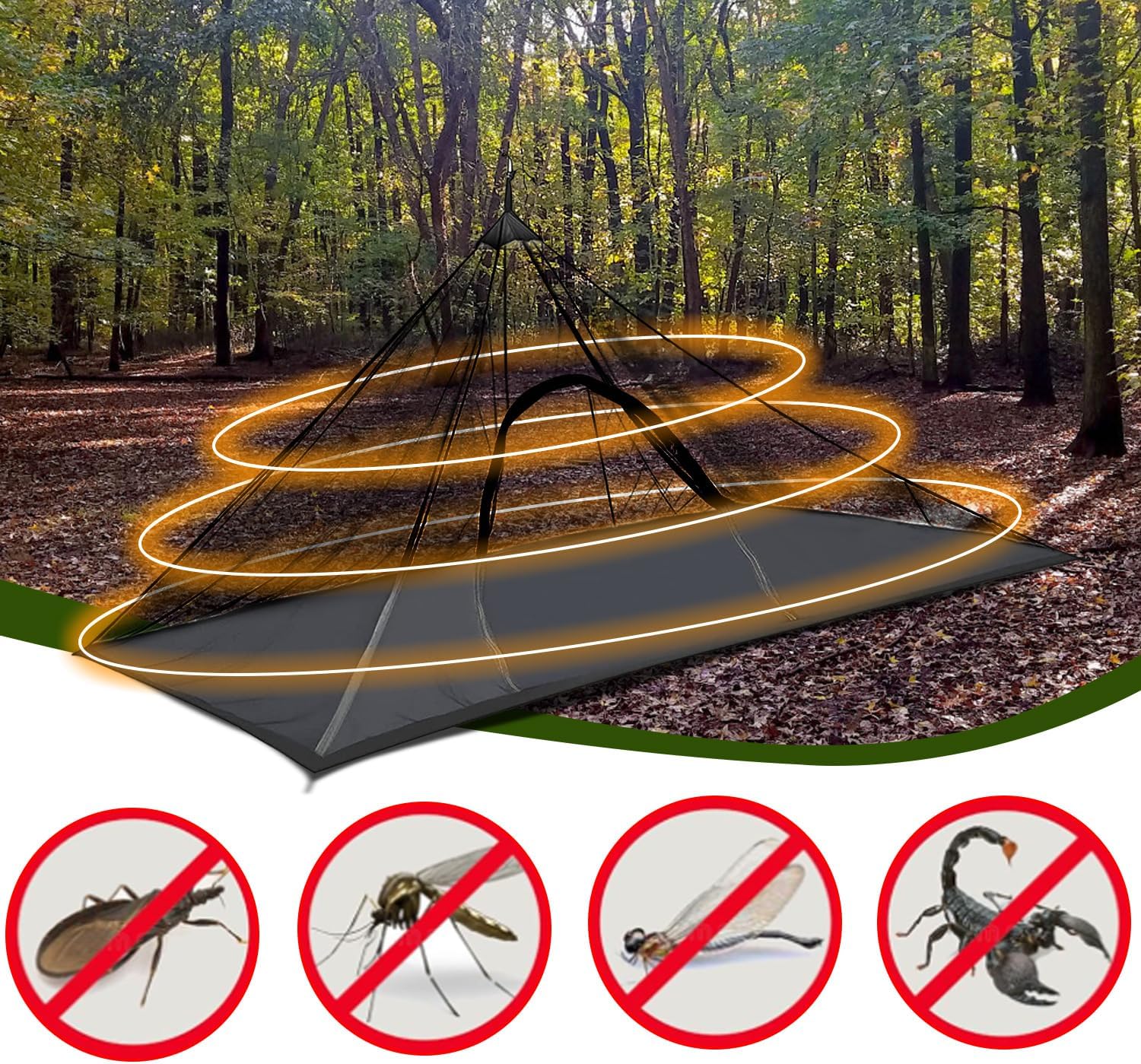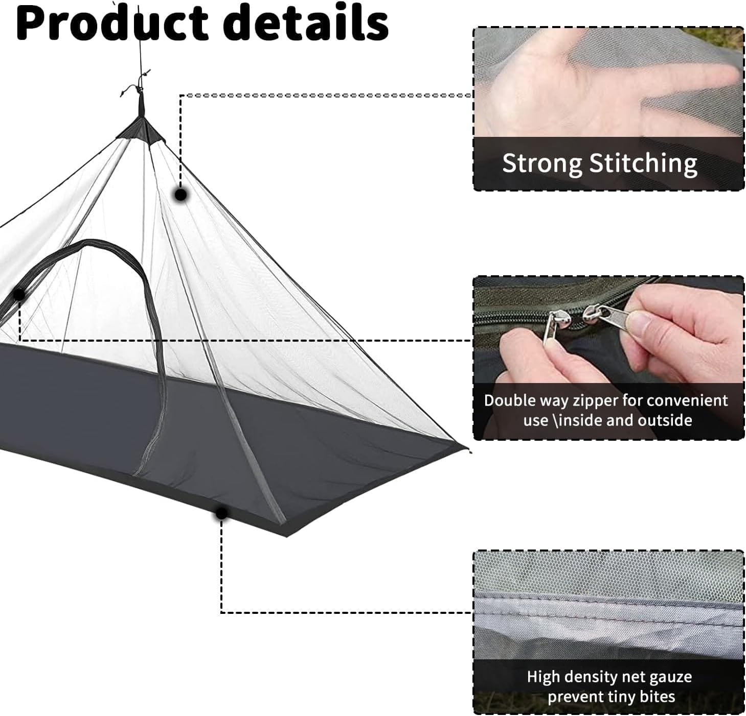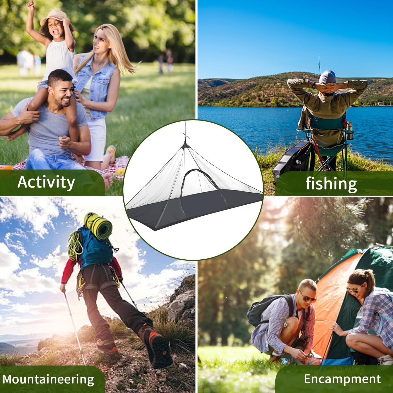 **Ευρεία Εφαρμογή:** Η κουνουπιέρα κάμπινγκ μας είναι ιδανική για όλες τις περιπέτειες ταξιδιού σας, όπως κατασκηνώσεις, πεζοπορίες και ακόμη και για χρήση στον κήπο σας για να παρακολουθήσετε τα αστέρια. Προστατεύει από κουνούπια, μύγες, ιπτάμενα έντομα, μέλισσες, πασχαλίτσες και άλλα ενοχλητικά έντομα ενώ κοιμάστε έξω.