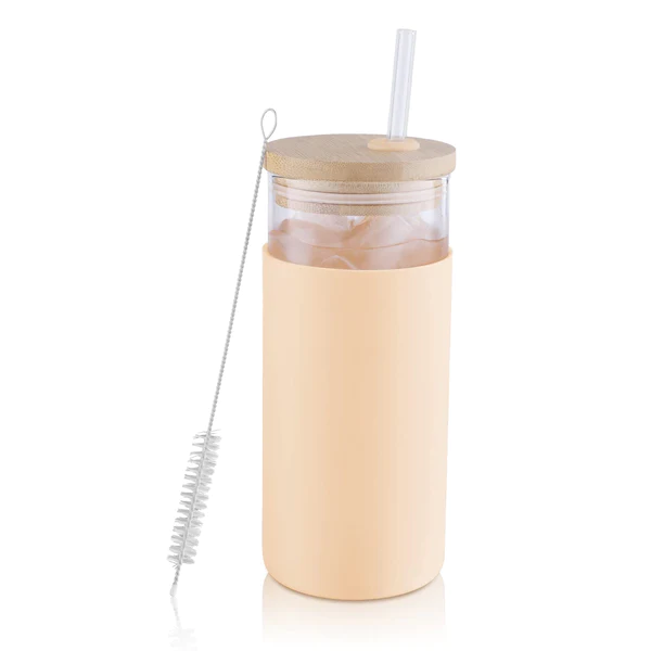 Γυάλινο Ποτήρι με Θήκη Σιλικόνης 550ml & Καπάκι από Μπαμπού