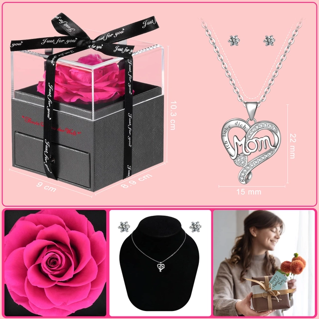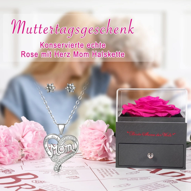 Το κουτί με τα τριαντάφυλλα και τις λέξεις “Best Mama der Welt”. Μέσα στο κουτί δώρου με το τριαντάφυλλο και το κολιέ υπάρχει ένα μικρό συρτάρι με ένα κολιέ “Σ’ αγαπώ μαμά”, καθιστώντας το ένα όμορφο πολυτελές δώρο που μπορεί επίσης να χρησιμοποιηθεί ως κουτί κοσμημάτων ή κουτί δαχτυλιδιών.