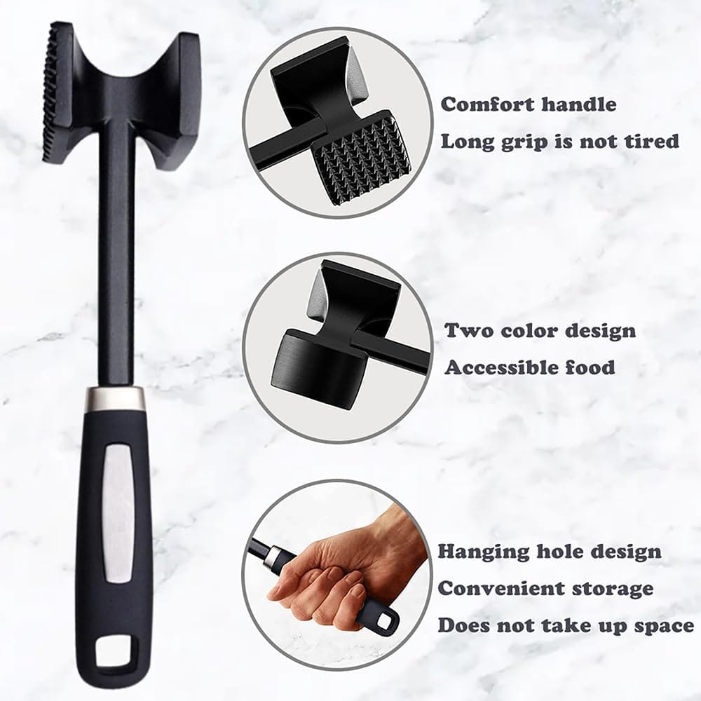-Εργονομικός σχεδιασμός: Το υψηλής ποιότητας σφυρί κρέατος έχει μαλακή νάιλον λαβή που ταιριάζει άνετα στο χέρι και παρέχει εξαιρετικό κράτημα. Η μεγάλη κεφαλή του σφυριού και η ισορροπημένη σχεδίαση επιτρέπει στο σφυρί να κάνει όλη τη δουλειά σε λιγότερο χρόνο. Πολύ κατάλληλο για άτομα με αρθρίτιδα.