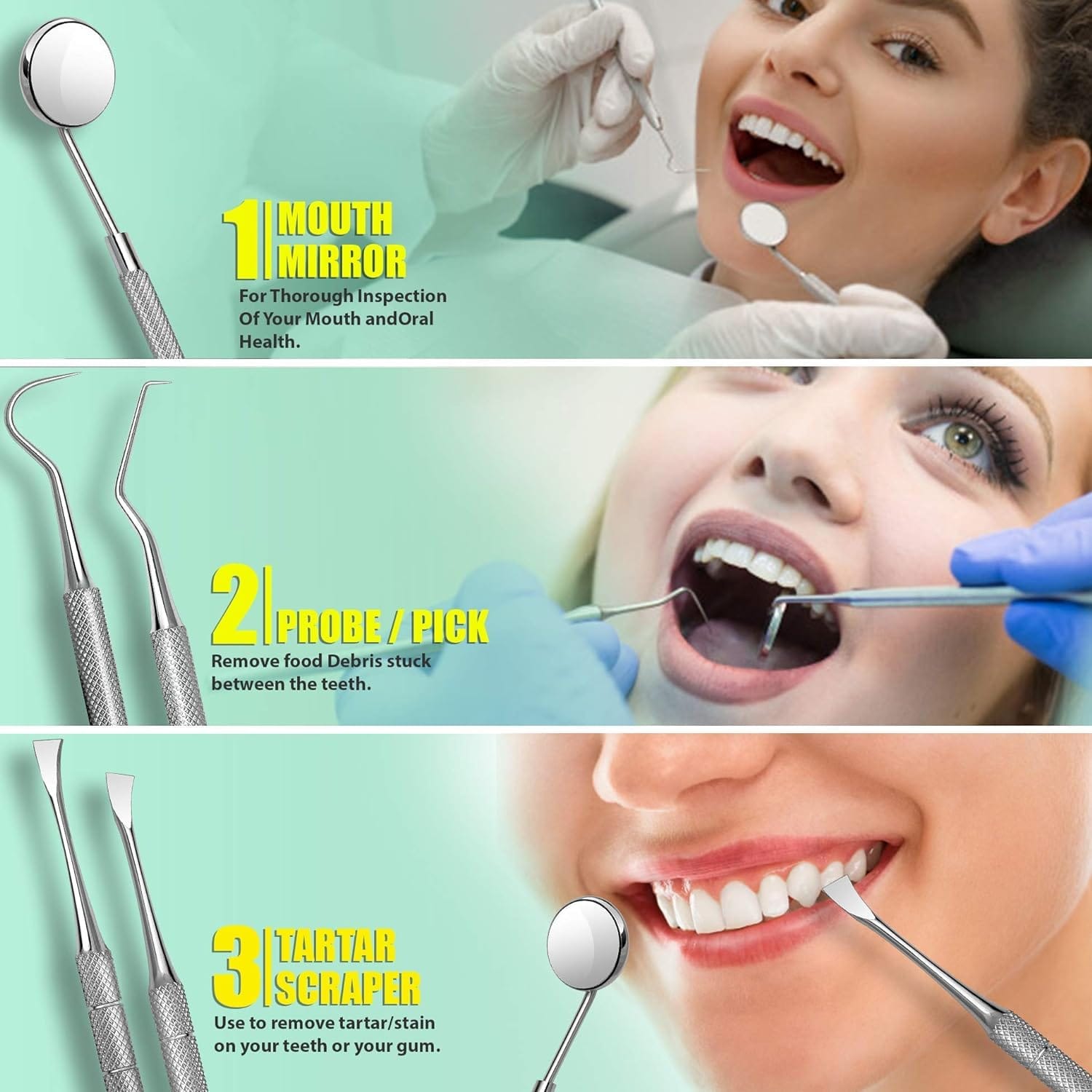 5 οδοντιατρικά εργαλεία για την αφαίρεση πλάκας και πέτρας: οδοντική λαβή, οδοντικός καθετήρας, ξύστρα τρυγίας, καθρέφτης δοντιών και τσιμπιδάκια. Τα οδοντιατρικά εργαλία πλένονται στο πλυντήριο πιάτων.