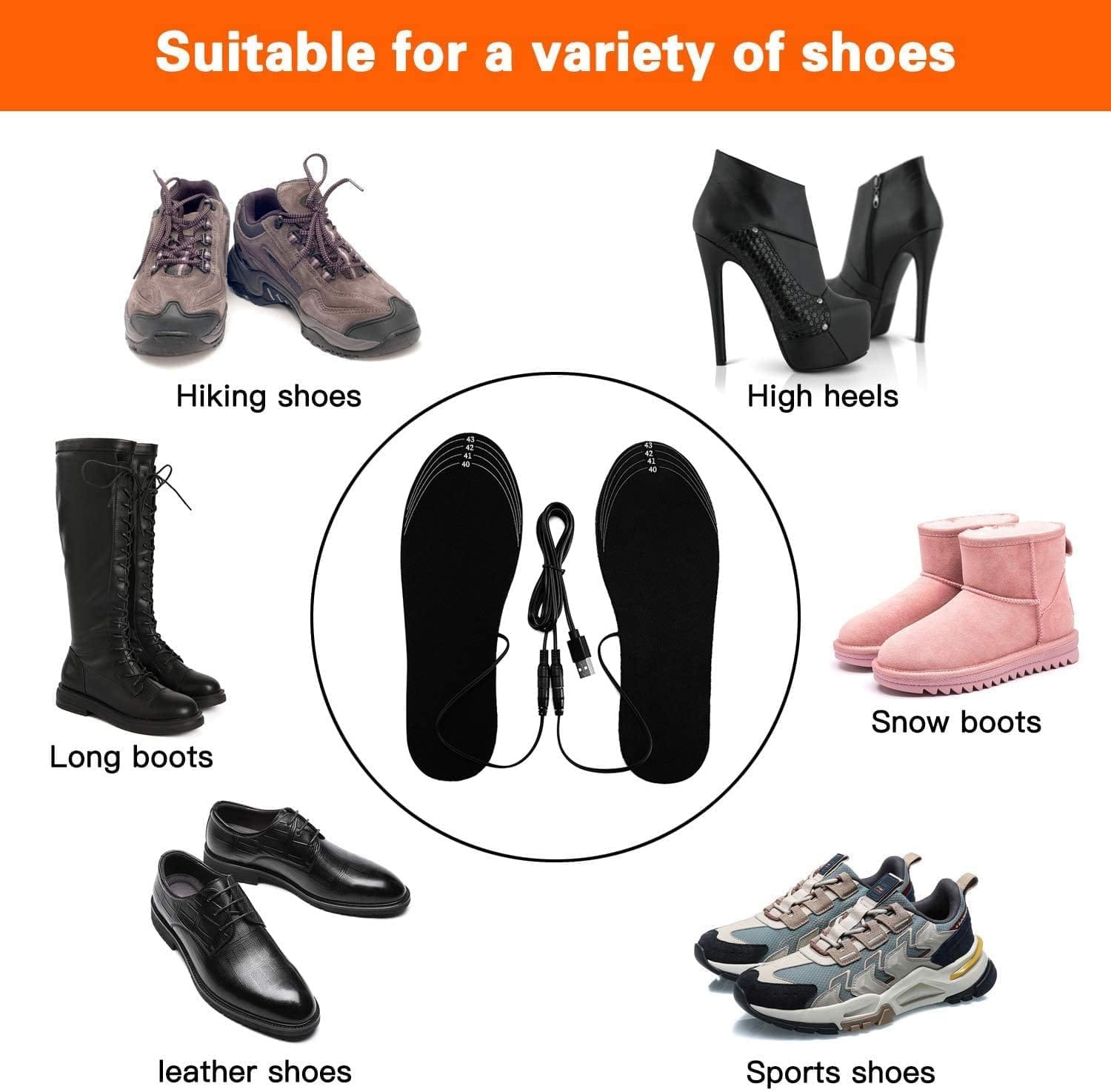 Ελεύθερη προσαρμογή μεγέθους: Οι ηλεκτρικοί πάτοι μπορούν να κοπούν και να προσαρμοστούν στο μέγεθος των παπουτσιών σας. Το εύρος μεγέθους υποδημάτων αναγράφεται πάνω στους πάτους για τη δική σας άνεση. Επιλέξτε το σωστό μέγεθος, οι γραμμές στους πάτους είναι ευδιάκριτες και εύκολες για κόψιμο. Κατάλληλοι για άνδρες και γυναίκες με μέγεθος EU 35-46.