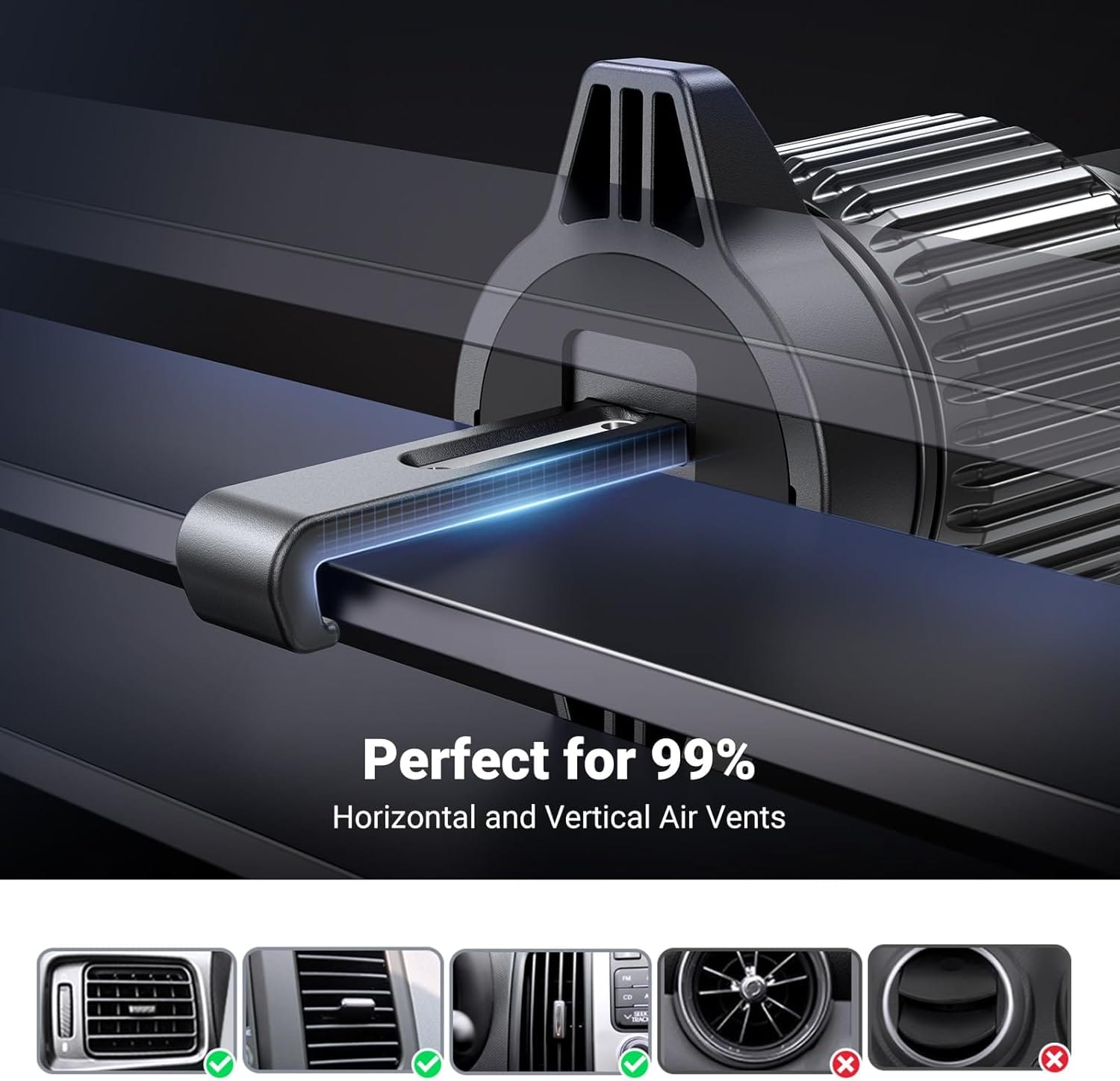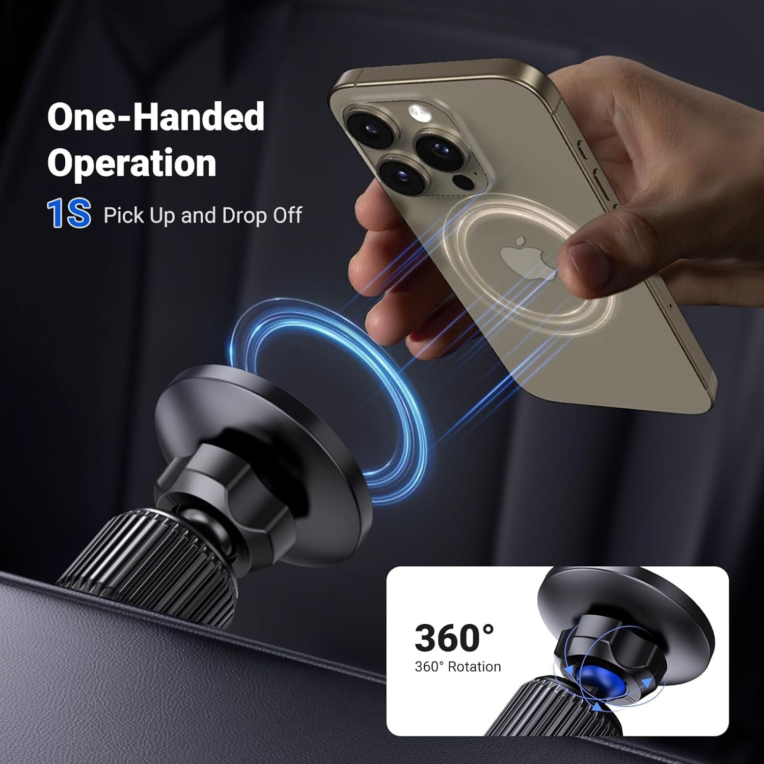 Εύκολη εγκατάσταση και ρύθμιση: Η βάση αυτοκινήτου για MagSafe προσαρμόζεται εύκολα, απλά περιστρέφοντας το πόμολο για να ρυθμίσετε το μήκος του γάντζου και να το κλειδώσετε με ασφάλεια στον αεραγωγό. Διαθέτει εύκαμπτη περιστρεφόμενη κεφαλή 360°, επιτρέποντας πλήρη ρύθμιση της γωνίας θέασης για βέλτιστη εμπειρία. Εύκολη σύνδεση και αποσύνδεση του τηλεφώνου με το ένα χέρι, για μέγιστη ευκολία χρήσης.